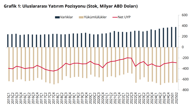 Türkiye’nin net Uluslararası Yatırım Pozisyonu, 2025 Şubat itibarıyla 279 milyar dolara geriledi. Yurt dışı varlıkları %0,1 azalırken, yükümlülükler %1,5 düştü.