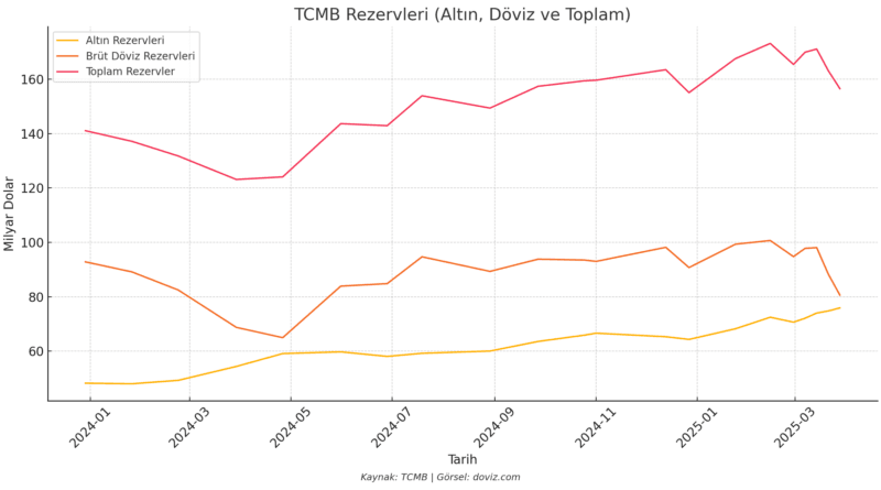 Türkiye Cumhuriyet Merkez Bankası (TCMB) rezervleri, 28 Mart haftasında 6,6 milyar dolar azaldı. Brüt döviz rezervleri 80,6 milyar dolara geriledi.